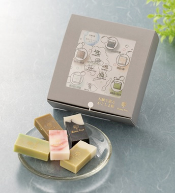 知覧の緑茶石鹸を含む、鹿児島の自然素材を活かした石鹸を5種類詰め込みました。鹿児島の石鹸で、温泉巡りの旅をした気分になっていただけますように。