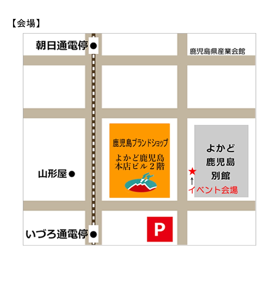 ①よかど鹿児島 別館ビル屋外特設会場 (※ 「よかど鹿児島」本館裏にある別館ビル側歩道(よかど鹿児島所有スペース内)) ②鹿児島ブランドショップ(「よかど鹿児島」本店ビル2階) ※抽選会会場 |