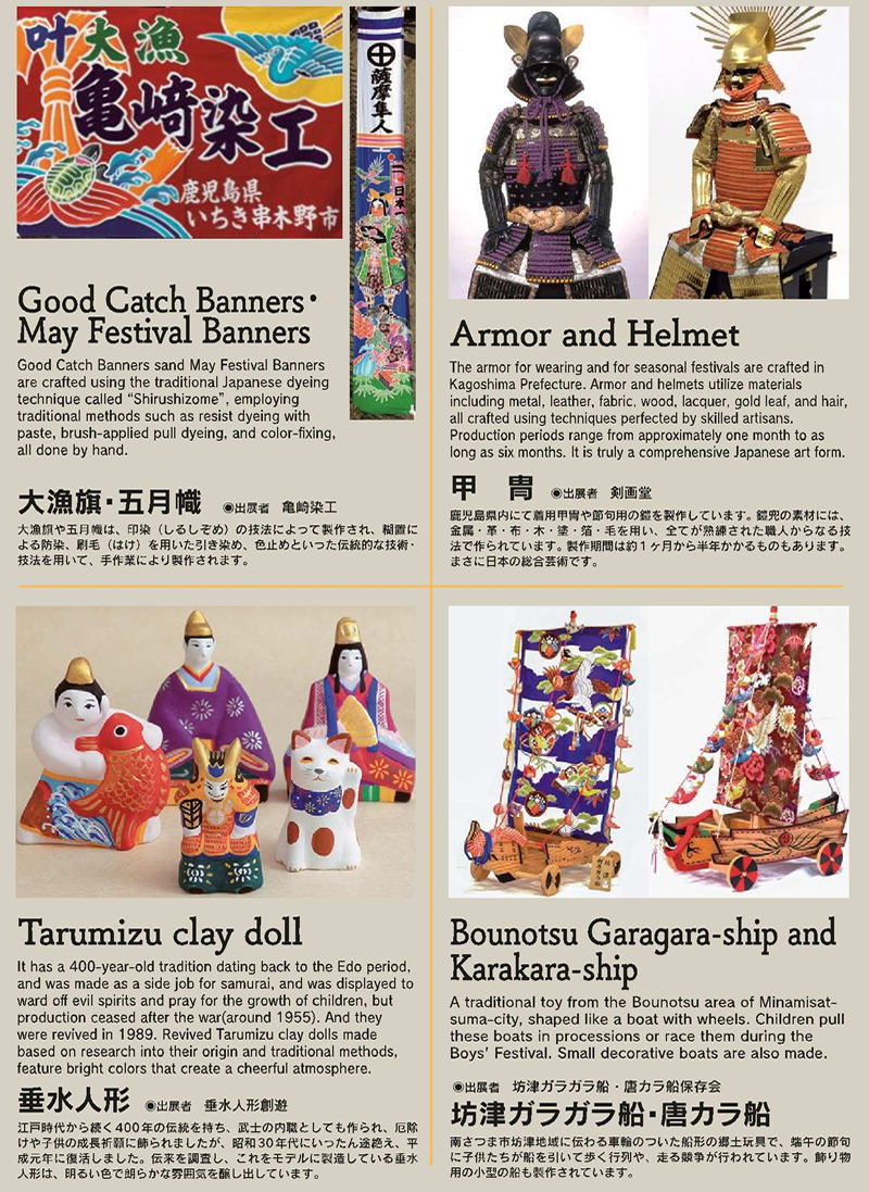 Kagoshima’s proud traditional art crafts, “ Satsuma Pottery ”, “ Oshima Tsumugi ”(Traditional Japanese fabric), “ Satsuma Kiriko ” (Traditional glass craft), “ Good Catch Banners・May Festival Banners ”,“ Armor and Helmet ”,“ Tarumizu clay doll ” and “ Bonotsu Garagara-ship and Karakara-ship ” are gathered in here! You can check and buy the NEW items!